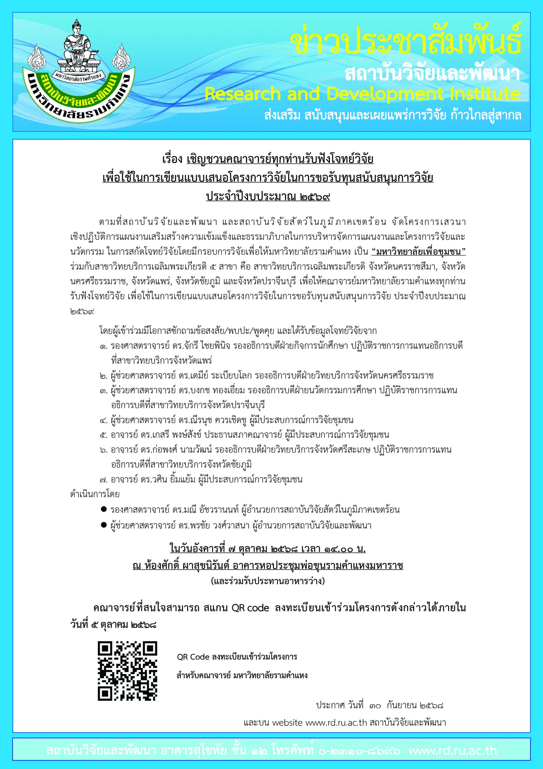 สถาบันคลังสมองแหงชาติ ขอเรียนเชิญเข้าร่วมหลักสูตร “การบริหารจัดการงานวิจัยแนวใหม่” รุ่นที่๒ เม.ย. 24, 2018 สถาบันวิจัยและพัฒนา มหาวิทยาลัยรามคำแหง สถาบันคลังสมองแห่งชา…