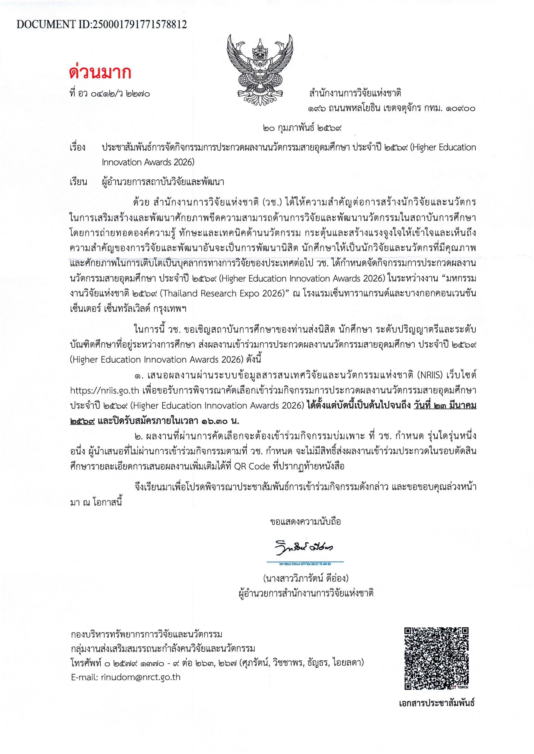 สำนักงานการวิจัยแห่งชาติ ประชาสัมพันธ์ ขอเชิญเสนอผลงานเพื่อขอรับรางวัลการวิจัยแห่งชาติ : รางวัลนักวิจัยดีเด่นแห่งชาติ รางวัลผลงานวิจัย รางวัลวิทยานิพนธ์ และรางวัลผลงานประดิษฐ์คิดค้น ประจำปีงบประมาณ 2570 มี.ค. 18, 2026 สถาบันวิจัยและพัฒนา มหาวิทยาลัยรามคำแหง