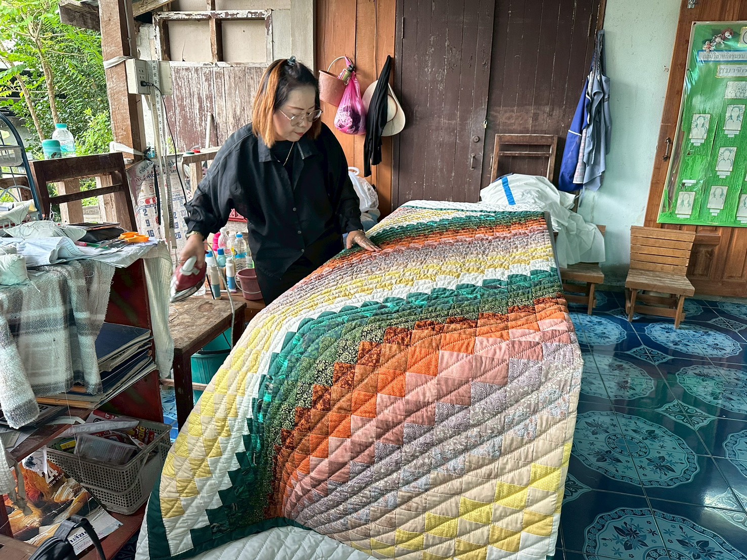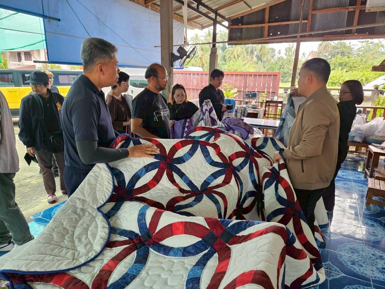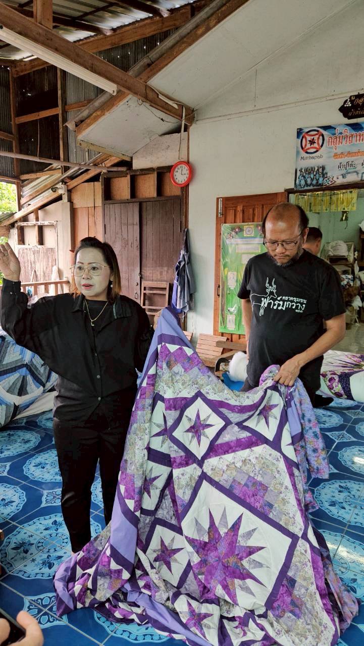 จากนั้นก็เริ่มต้น ”เข้าชุมชน“ ดูผ้าด้นมือ ของกลุ่มชาวบ้าน ที่ใช้เศษผ้าสีอันเล็ก ๆ มาเย็บประกอบกันเป็นผ้านวม ผ้าคลุมเตียงผืนใหญ่