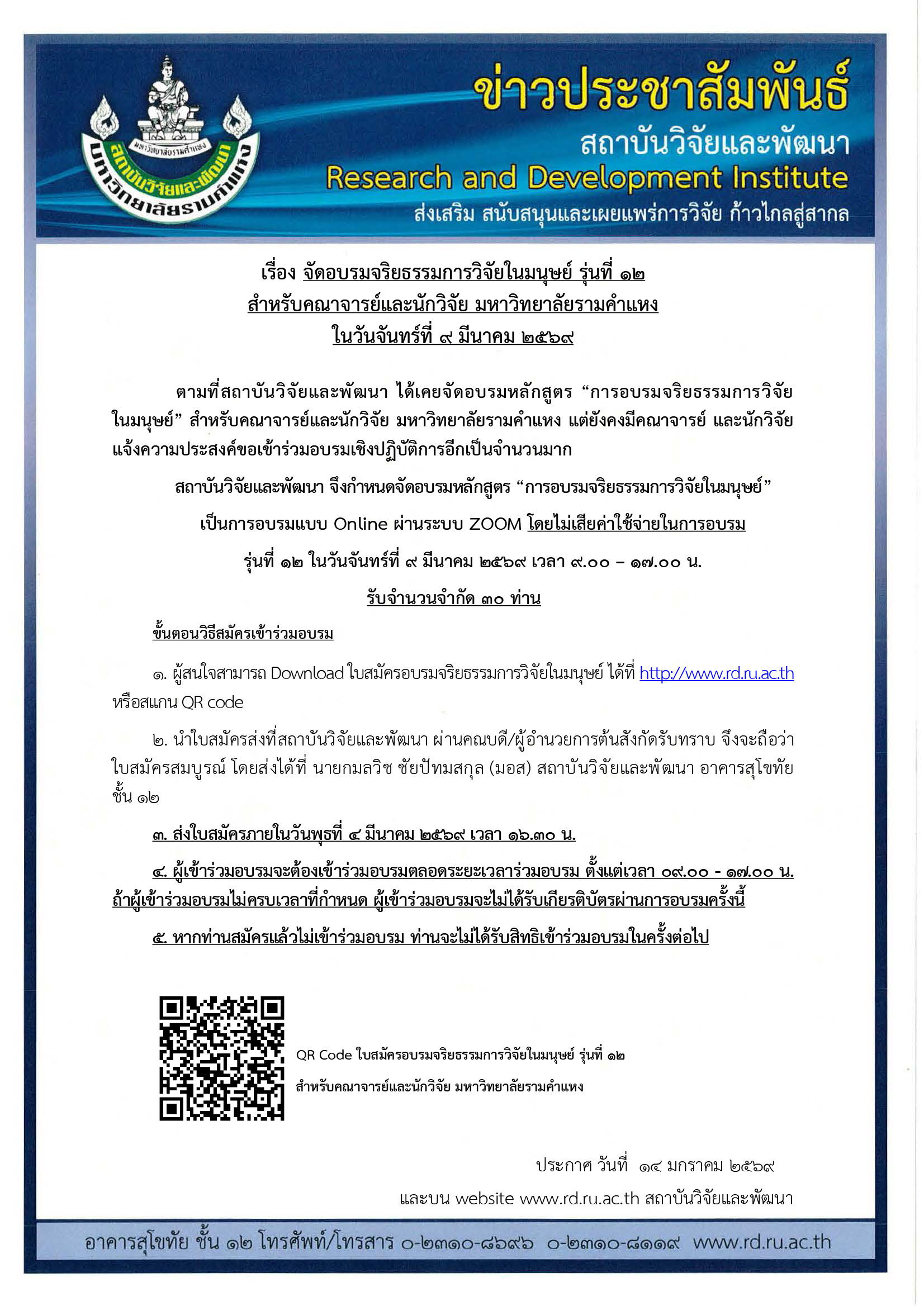 ประชาสัมพันธ์ จัดอบรมจริยธรรมการวิจัยในมนุษย์ รุ่นที่ 12 สำหรับคณาจารย์และนักวิจัยมหาวิทยาลัยรามคำแหง ในวันจันทร์ที่ 9 มีนาคม 2569