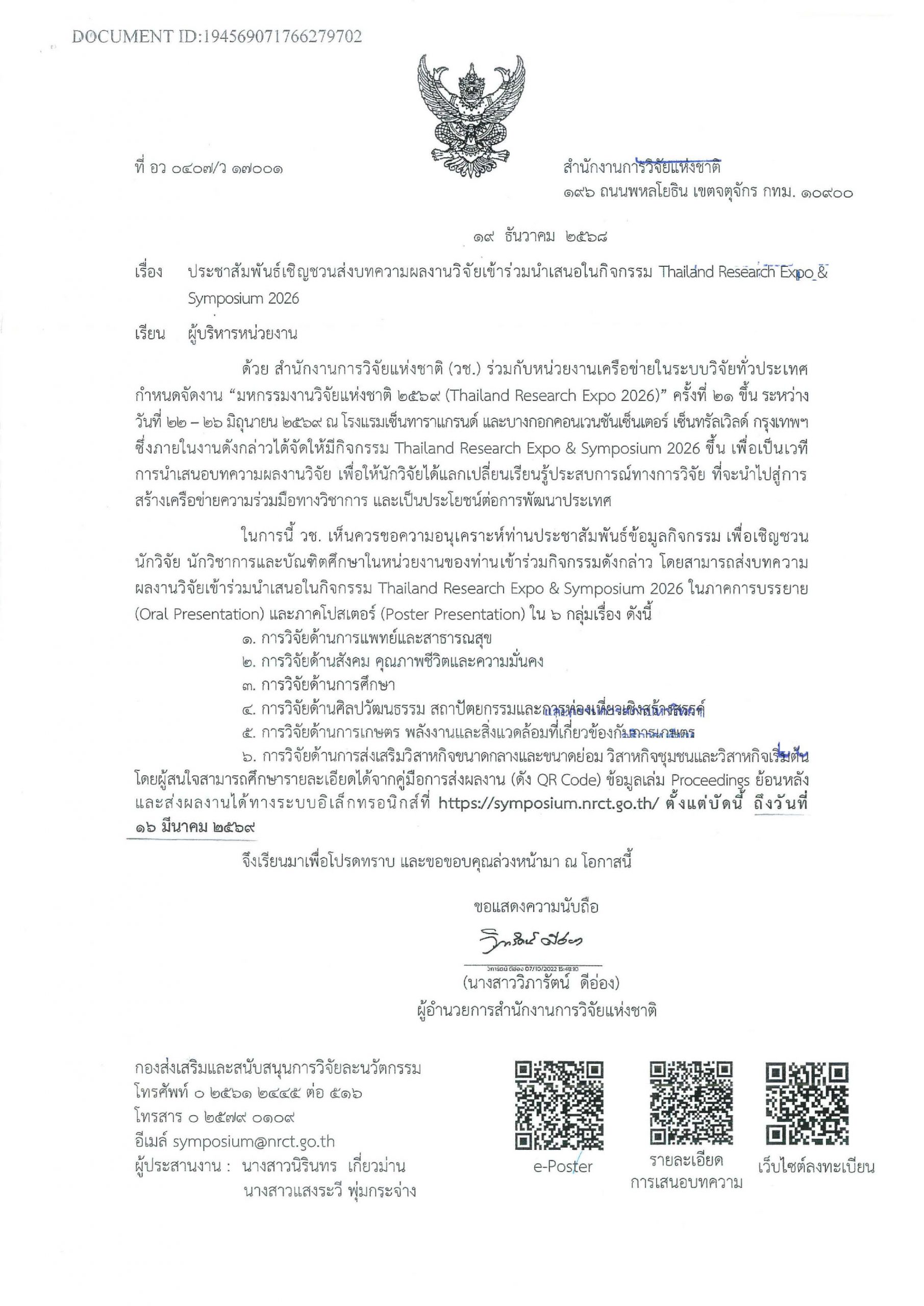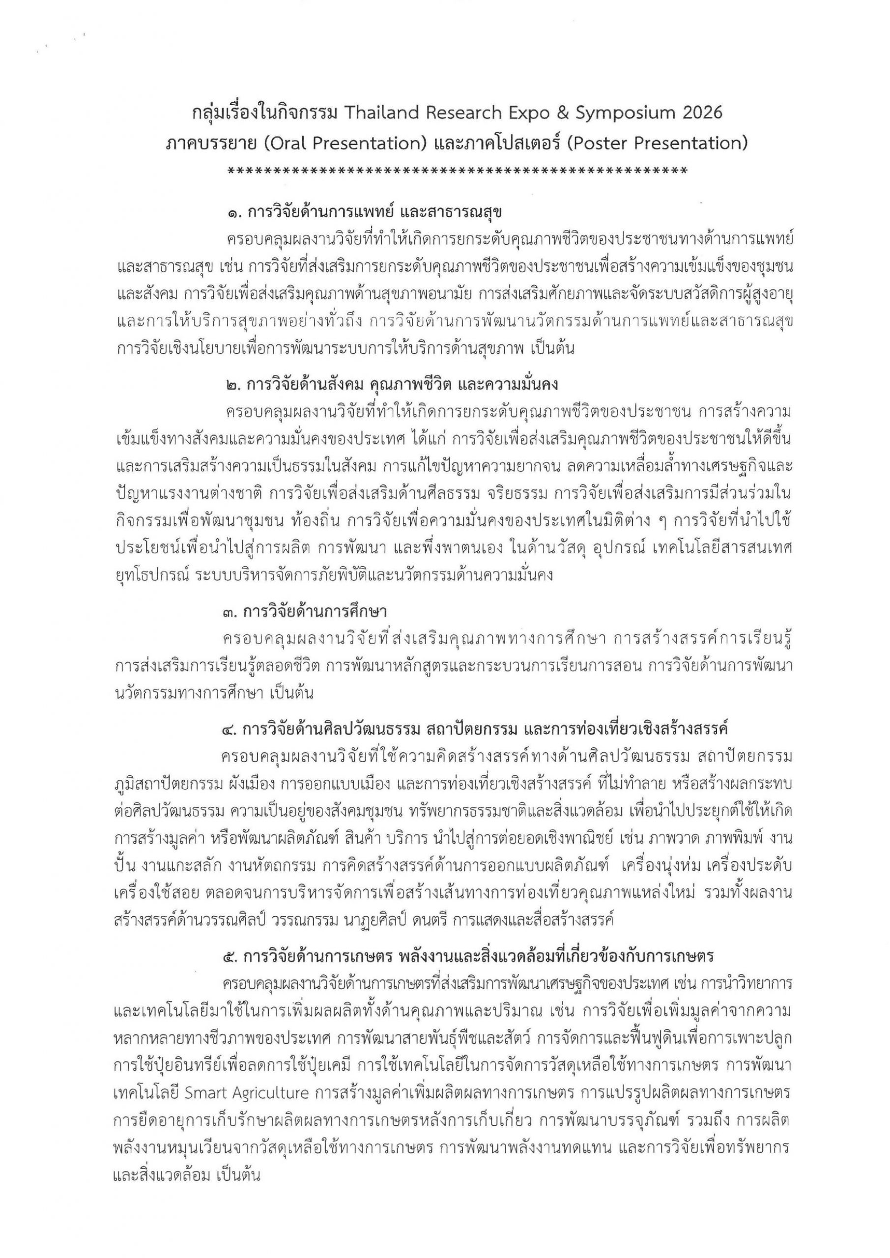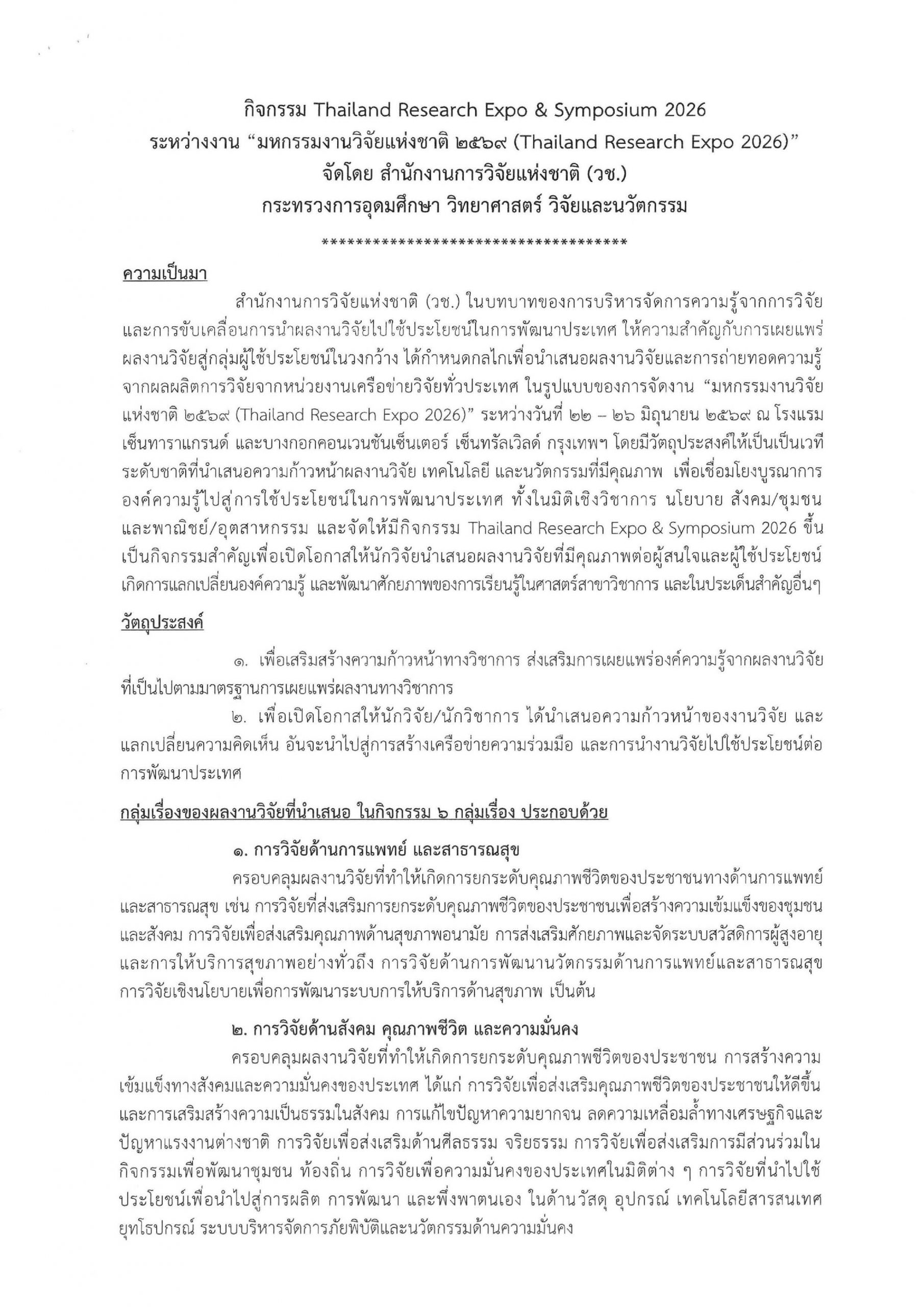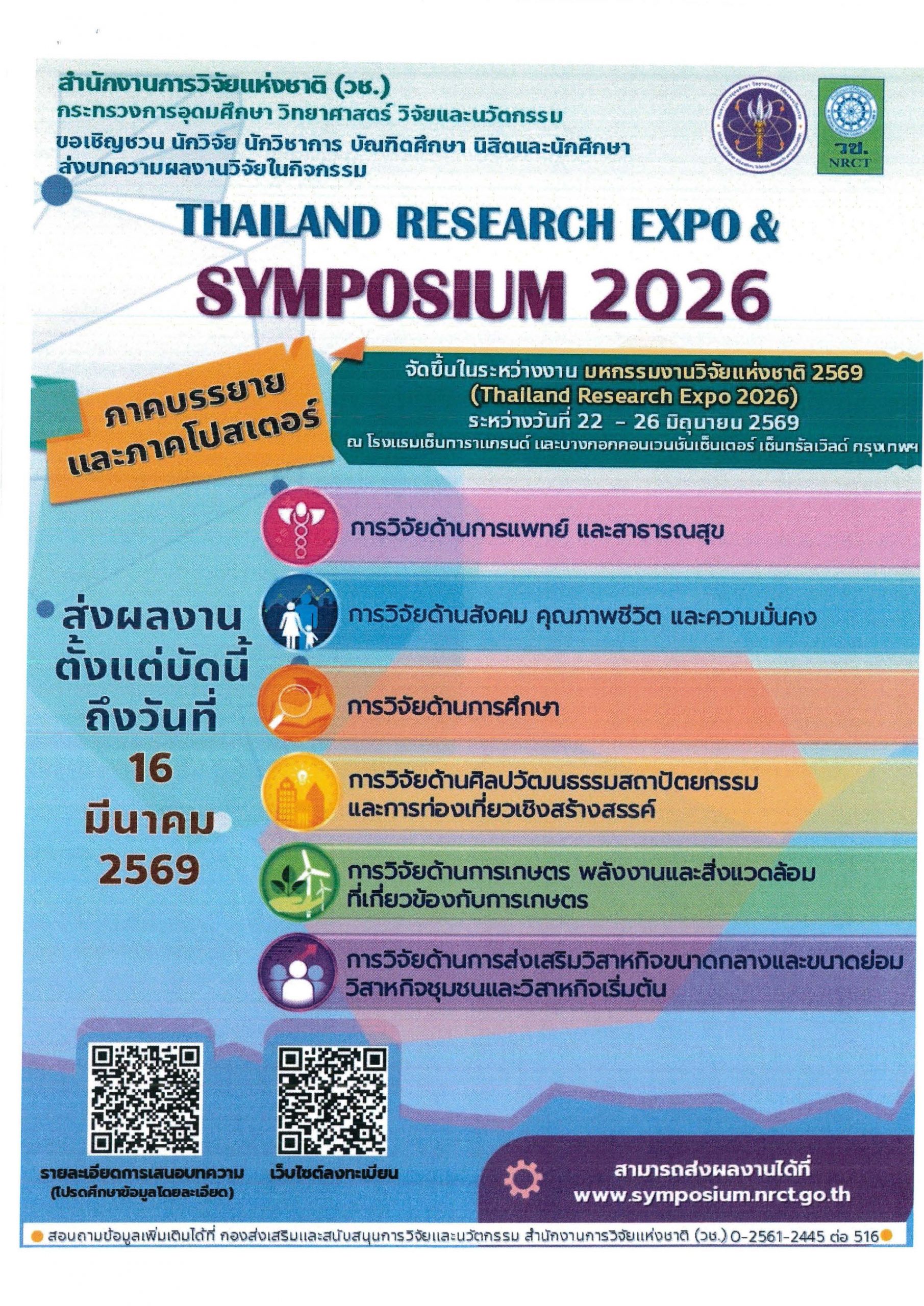 ประชาสัมพันธ์ เชิญชวนส่งบทความผลงานวิจัยเข้าร่วมนำเสนอในกิจกรรม Thailand Research Expo & Symposium 2026