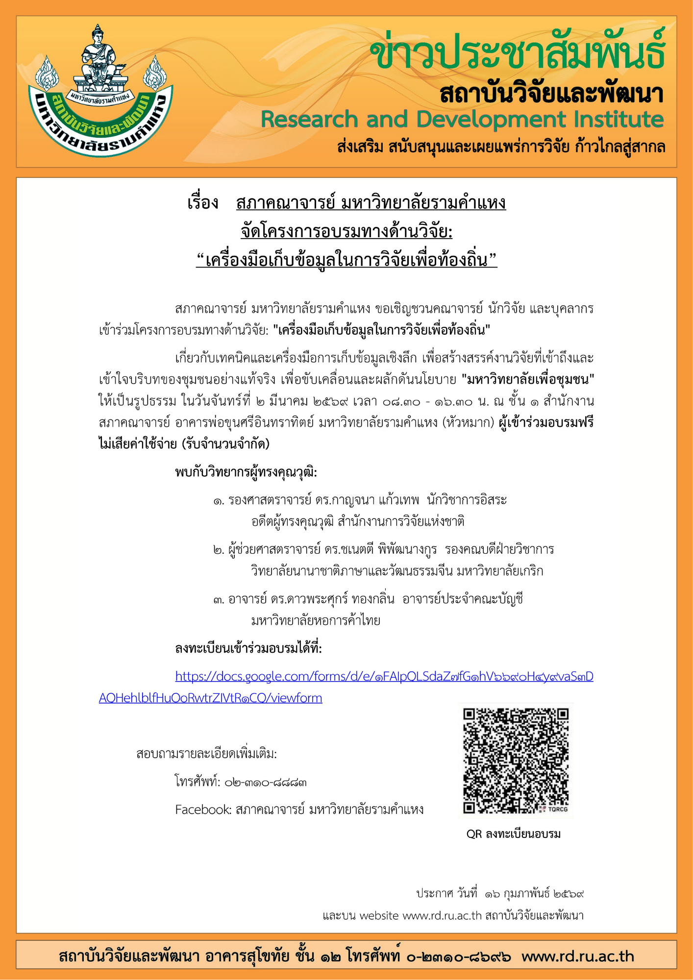ประชาสัมพันธ์ สภาคณาจารย์ มหาวิทยาลัยรามคำแหง จัดโครงการอบรมทางด้านวิจัย: “เครื่องมือเก็บข้อมูลในการวิจัยเพื่อท้องถิ่น”